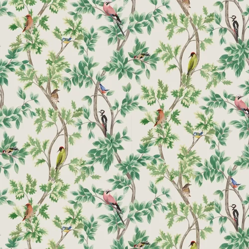 A beautiful paper showing Woodpeckers, Jays, Blue-tits and other garden birds perching amongst the foliage of two lush green trees; highlighted by the splash of lime, pink and blue from the birds feathers. Shown here in the Ivory / Leaf colourway. Please note: This is a wide width roll.