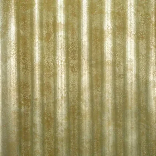 Printed on a holographic surface, resembles panels of antique precious metal – giving a rich striped effect when lit – shown in the gold colour. The actual pattern repeat is 61 cm but the design can be hung as a free pattern match.