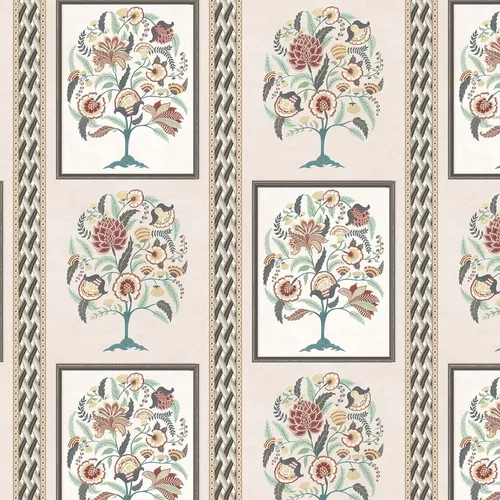A contemporary tree-of-life design with paisley flowers, presented within ornate picture frames, within a lattice border stripe. Seen here in the Eucalyptus / Charcoal colourway.