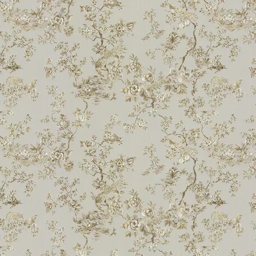 An elegant heavyweight Italian vinyl wallpaper with a romantic trailing floral design. This intricate design has an embroidered texture, featuring pretty birds perched on delicate branches. Shown here in a Soft Gold colourway. This is an extra wide width design.