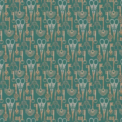 The key to Alice’s wonderland, an abundance of ornate keys and antique scissors glisten in a wonderful display of whimsicality. A metallic print with an aged appearance resembles the true nature of such trinkets, while richly coloured backgrounds add depth and dimension.Inspired by a fluid satin dress adorned by spheres of keys and antique objects, the original Temperley design was influenced by spiritual mandalas. Maintaining the symbolism of the original print, elements of the design were repositioned to create this opulent wallcovering.