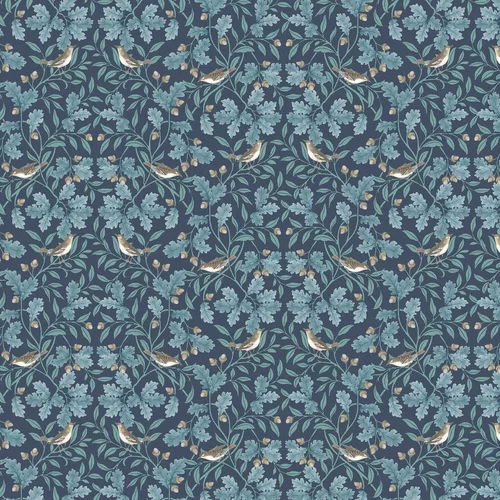 Birds, acorns and oak leaves in a delightful repeating pattern, creating a tranquil country feel. Shown in the Navy blue colourway.