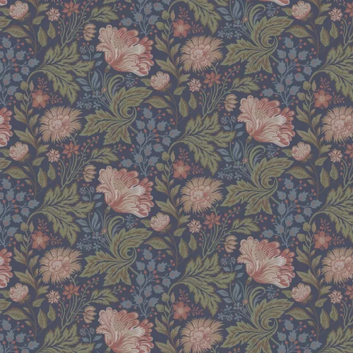 A flamboyant floral design with intricately detailed flowers and leaves. Shown in the autumn dark blue colourway. Non-woven paste the wall product.