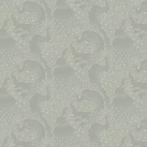 Look carefully amongst the delicate swirling leaves to see beautifully sitting peacock birds in a linear and soft art style. Seen here in the Sage Green colourway.