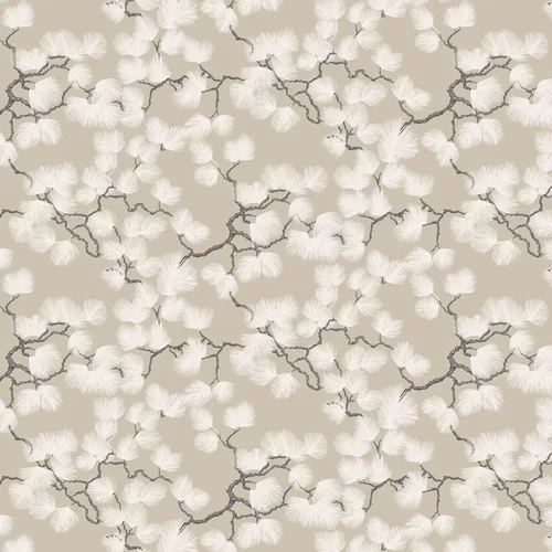 An all over wallpaper design featuring a trailing pattern of stylised pine. Seen here in the Beige colourway.