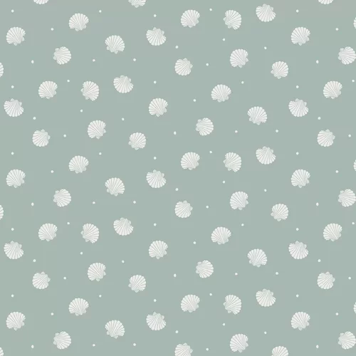 A simple scallop shell motif, scattered randomly across the design with small white dots. Shown in the soft Teal green colourway.