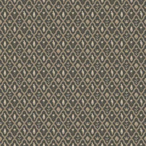 A glamorous and inquisitive design featuring playful motifs amongst a scalloped trellis print, containing a crowns, stars, doves and flowers. Please note: Actual pattern repeat is 27cm. Seen here in the Charcoal colourway.