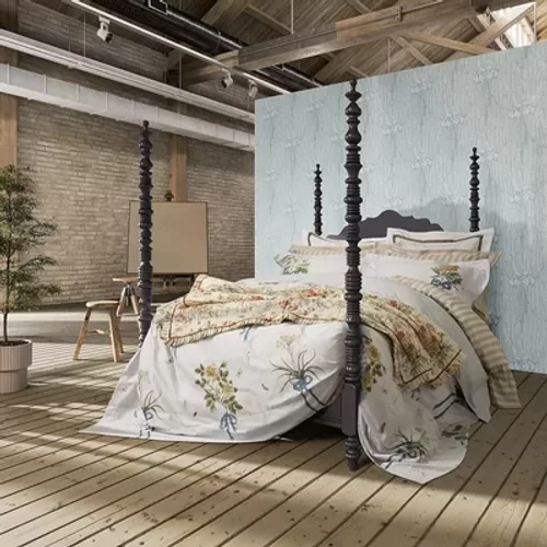 The original Sanderson design, Etchings & Roses, has been elegantly repainted in a botanical illustration style and produced as a beautiful bedding set in a quince/chalk colour palette including yellows, powder blues and ivory. Featuring rare and beautifully engraved prints from Mulhouse, faithfully reproduced, and including miniature insects scattered throughout the design, Cupid’s Beau is elevated to the next level of contemporary design with Giles’s illustrative bows and signature ‘G’ in a calligraphy style. A pair of Oxford pillowcases are included in the sets.