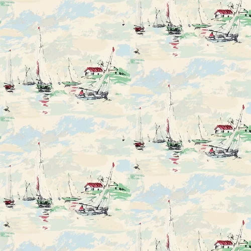 A painterly, dreamy scene of sailing boats gliding across the horizon, a classic 1950s wallpaper design. Shown in natural colours with green highlights. Wide width product.