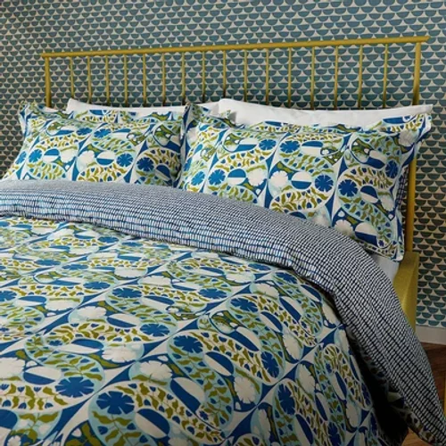 Flowing serpentine shapes intertwine with floral woodblock motifs in this playful geometric design, featuring earthy blues, whites, and greens. The reverse showcases the minimalist Tikku print, with delicate mark-making patterns, all printed on 100% cotton. Included in the set is the matching Oxford pillowcase.