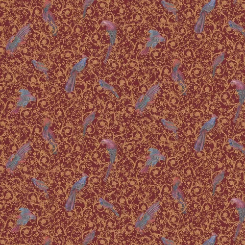 Colourful parrots and cockatoos sit expectantly on a wall of swirling printed and embossed pattern of faux-Baroque scrolling flowers. A wide-width wallpaper.