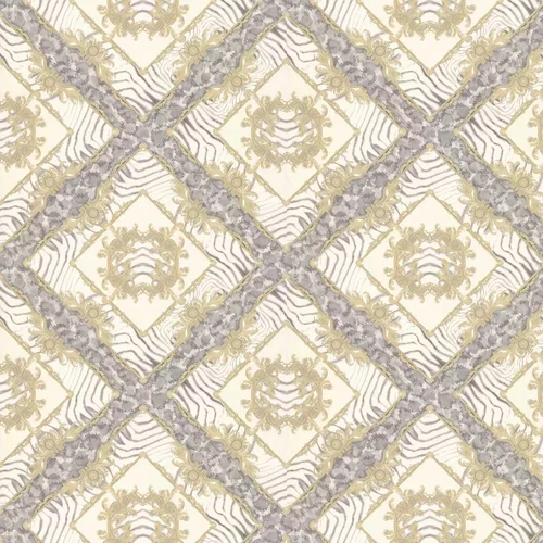 An exotic diamond trellis effect textured vinyl design with a symmetrical pattern covered with ornate detail and animal print. Shown here in the cream and grey colourway.