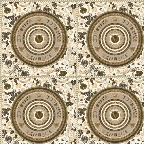 Iconic Versace design teeming with opulence and flamboyant flourishes. This wide width vinyl wallcovering features a circular motif, with the Versace logo and brand name at its centre. Tropical flowers and a square border frame the pattern. Shown here with bronze gold details.