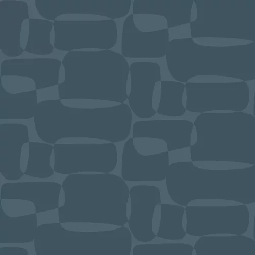 A geometric print featuring block shapes with distinct retro influences. Wide-width design, with a shorter than standard roll length. Shown here in a navy blue colourway.