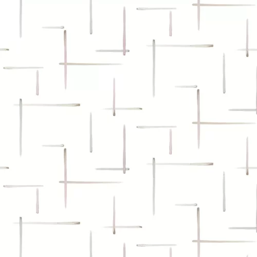 An understated design with painted lines against a fresh white ground. Lines are both vertical and horizontal, occasionally intersecting. Wide-width design, with a shorter than standard roll length.