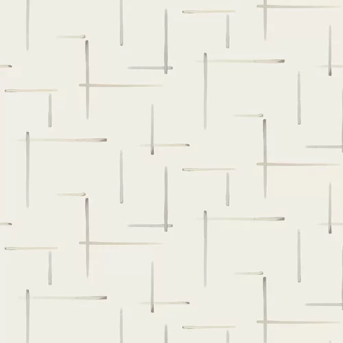 An understated design with painted lines against a fresh white ground. Lines are both vertical and horizontal, occasionally intersecting. Wide-width design, with a shorter than standard roll length.