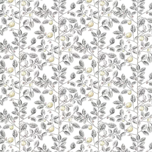 A contemporary lemon tree design with fruit and flowers and a vertical stem pattern. Shown here in the Dark Grey colourway with pink flowers. Wide width and shorter than standard roll length.