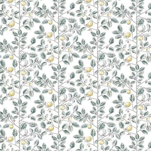 A contemporary lemon tree design with fruit and flowers and a vertical stem pattern. Shown here in the Dark Green colourway with red flowers. Wide width and shorter than standard roll length.