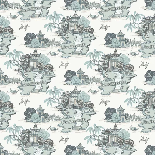 A modern take on the classic Chinese Pagoda toile with gardens joined with bridges, characters, willow trees and birds. Shown here in the gentle Jade Green colourway. Wide width and shorter than standard roll length.