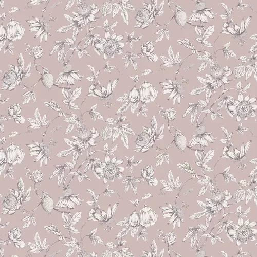An etching style design with a trailing passion flower pattern. Shown here in the dusky Lilac colourway which is grey / brown shade with a hint of pink. Wide width and shorter than standard roll length.